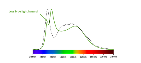 The tailor-made spectrum increases the 480nm and reduces the 450-460nm energy which is recognized as the main wavelength of blue hazard, therefore the Yuji Lighting Well24 Day™ series is not only helping with concentrating, but improving the healthy lighting simultaneously.